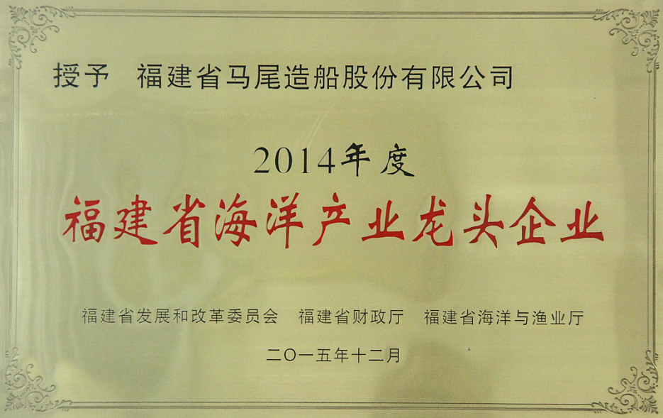 馬尾造船榮獲“2014 年度福建省海洋產(chǎn)業(yè)龍頭企業(yè)”稱號(hào)