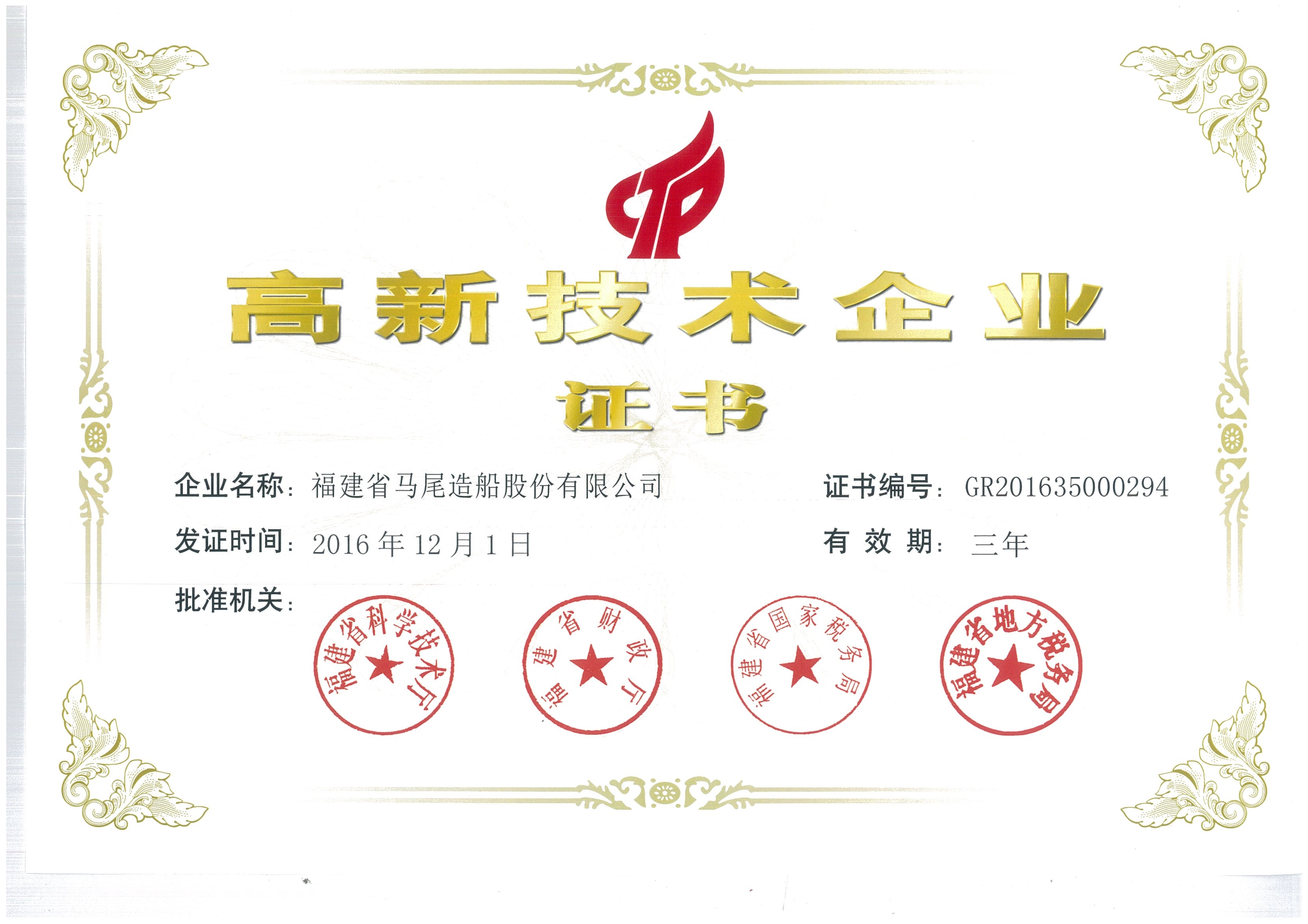 馬尾造船2016年榮獲“高新技術(shù)企業(yè)證書”