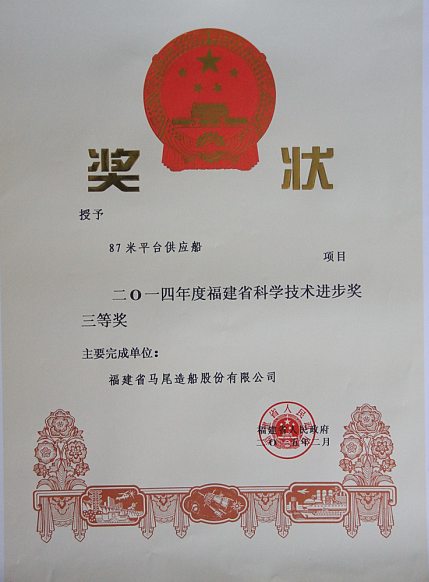 馬尾造船87米平臺(tái)供應(yīng)船榮獲福建省人民政府2014 年度“福建名牌產(chǎn)品”